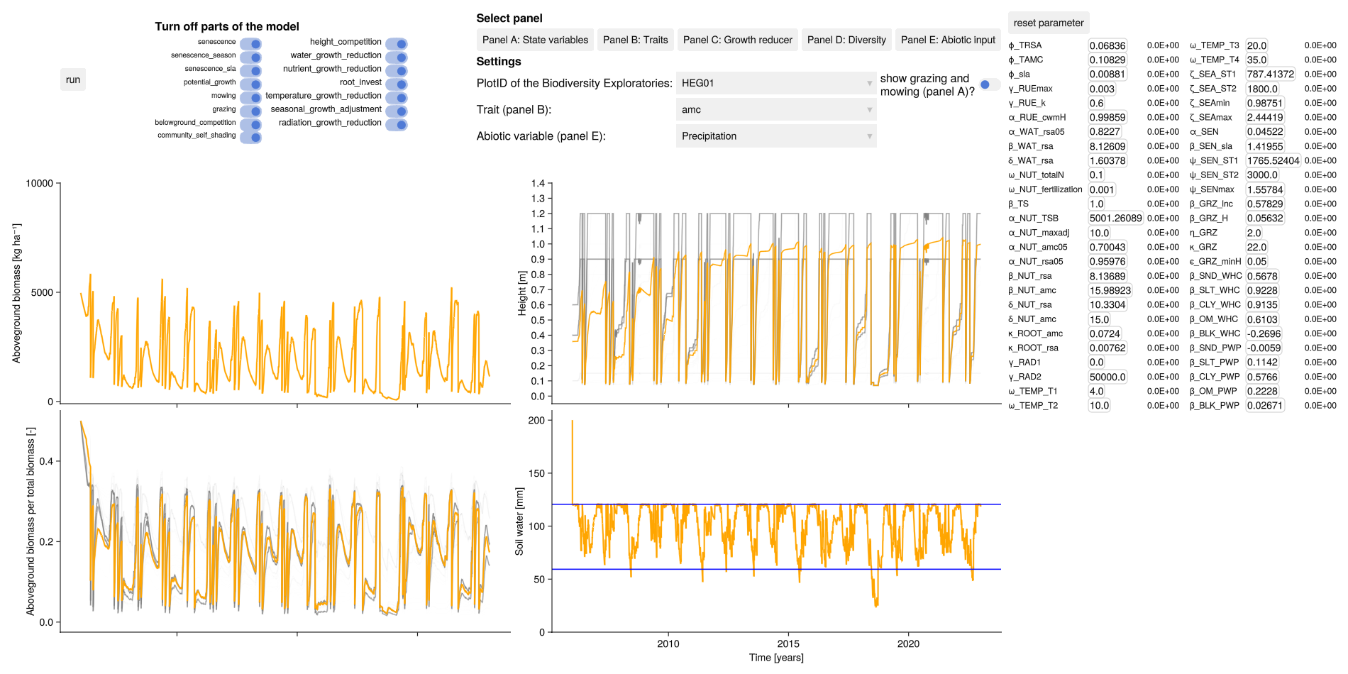 The dashboard can be used to graphically check the calibration results. It shows the simulated total biomass, soil water content and the simulated community weighted mean traits for all grassland plots of the Biodiversity Exploratories.